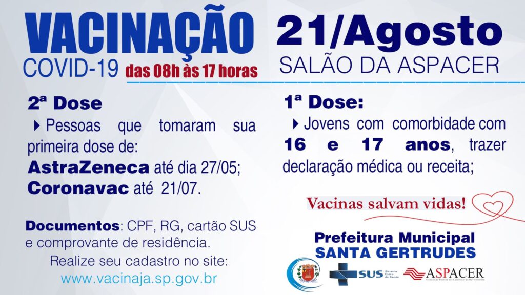 Dia 21 de Agosto Sábado será feito a vacinação da 1º dose contra a COVID-19 para quem tem 16 e...