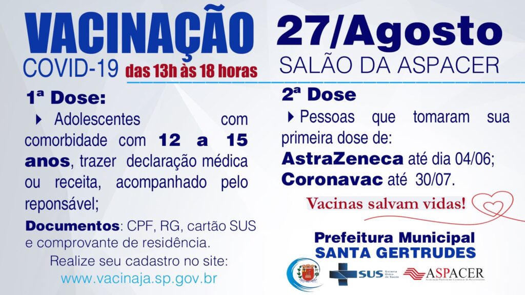 Dia 27 de Agosto Sexta-Feira será feito a vacinação da 1º dose contra a COVID-19 para quem tem 12 a...