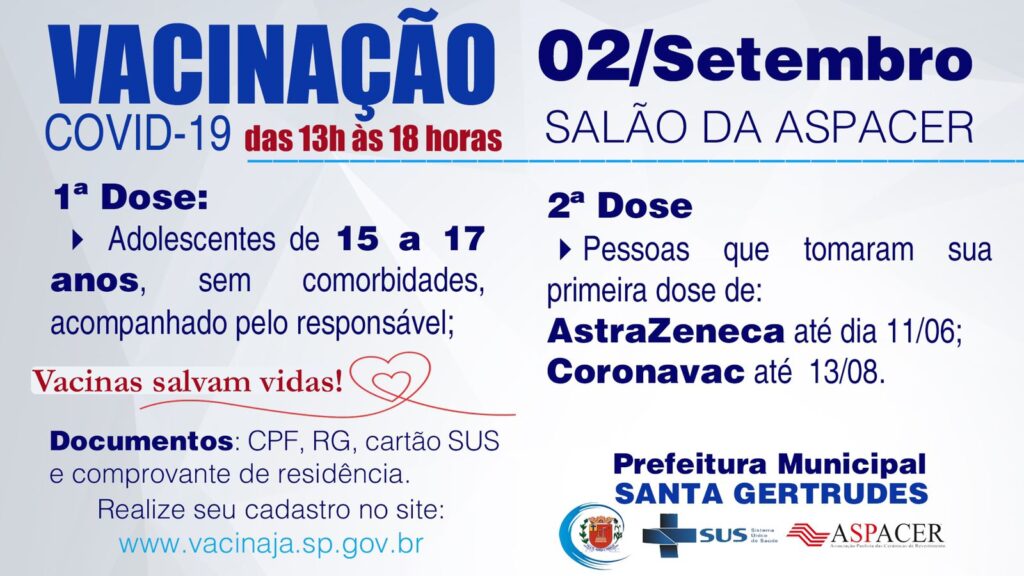 Dia 02 de Setembro Quinta-Feira será feito a vacinação da 1º dose contra a COVID-19 para quem tem 15 a...