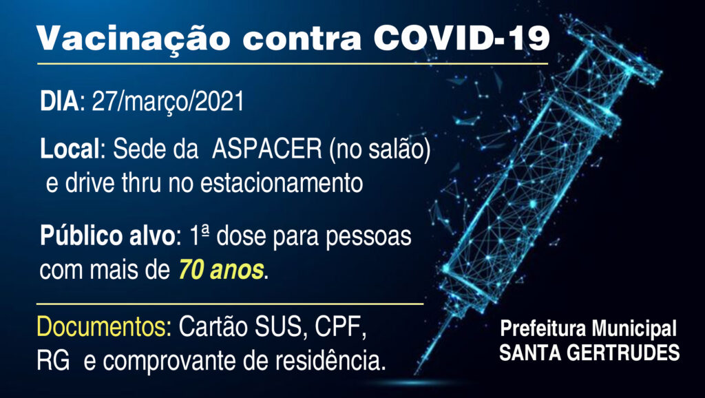 Dia 27 de Março SÁBADO será feito a vacinação contra a COVID-19 para quem tem 70 anos ou mais....
