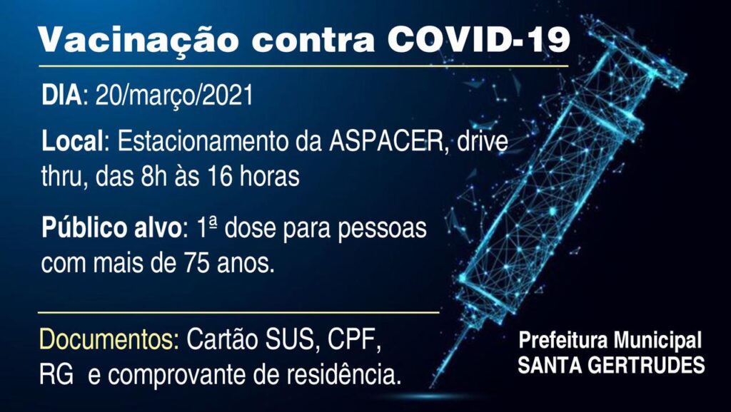 Dia 20 de Março SÁBADO será feito a vacinação contra a COVID-19 para quem tem 75 anos ou mais....
